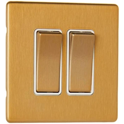 Double Gang two-way plateswitch Concealed screws provide a clean and flawless finish to the frontplate Satin Gold finish Matching large metal rocker switches White inserts, Manufacturer: MK