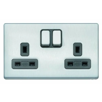 Double gang, switched socket outlet with double pole switching Two earth terminals on a common busbar provide a double earth facility for installations that require a high integrity protective connection Brushed Chrome finish Matching metal rocker switches Black inserts, Manufacturer: MK