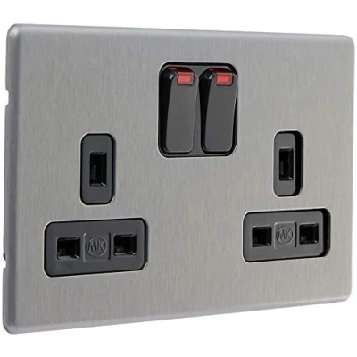 Double gang, switched socket outlet with double pole switching and neon indicators Two earth terminals on a common busbar provide a double earth facility for installations that require a high integrity protective connection Brushed Chrome finish Neon indicators in the switch rockers with 175° in the horizontal and vertical planes Black inserts, Manufacturer: MK