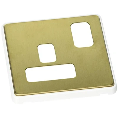MK Dimensions 1 Gang 13A DP Dual Earth Switch Socket Satin Brass Finish Frontplate with a White Trim