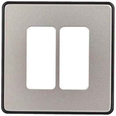 MK Dimensions 2 Gang 20A Large Rocker Switch Satin Steel Finish Frontplate with a Black Trim