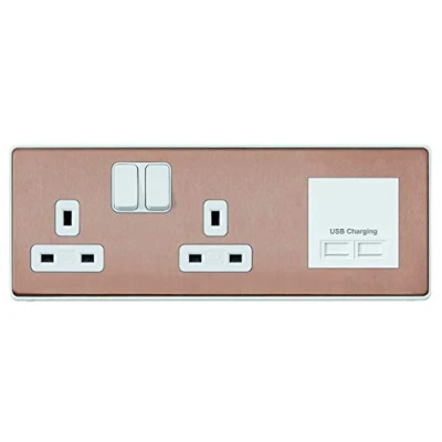 MK Dimensions 2 Gang Combi Switch Socket Bronze Finish with a White Trim Multimedia Plate Left Side Euro Frame