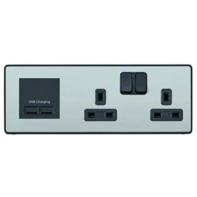 MK Dimensions 2 Gang Combi Switch Socket Stain Steel Finish with a Black Trim Multimedia Plate Left Side Euro Frame