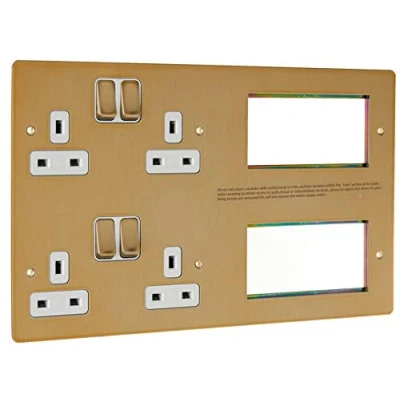 Stacked combination plate with 2 double gang switched 13A sockets and 8 euro module slot Stylish slim line design with a frontplate profile of only 1.5mm Satin Gold finish Matching flathead screws used throughout White Inserts, Manufacturer: MK