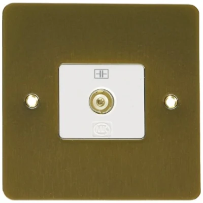 Single TV/FM isolated output Stylish slim line design with a frontplate profile of only 1.5mm Satin Gold finish Matching flathead screws used throughout White Inserts, Manufacturer: MK