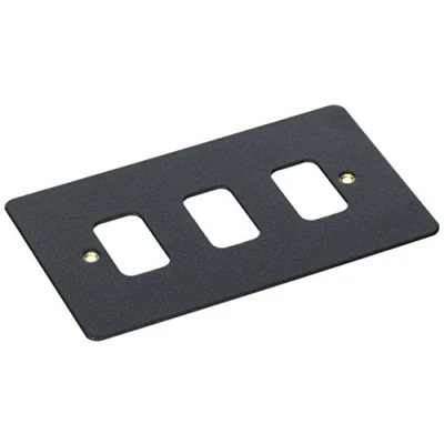 3 module frontplate Stylish slim line design with a frontplate profile of only 1.5mm Lustrous Black finish Matching flat head screws used Supplied with mounting frame, Manufacturer: MK