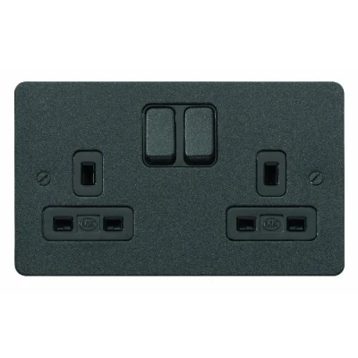 Double gang, switched socket outlet with double pole switching Two earth terminals on a common busbar provide a double earth facility for installations that require a high integrity protective connection Lustrous Black finish Black inserts Stylish slim line design with a frontplate profile of only 1.5mm, Manufacturer: MK