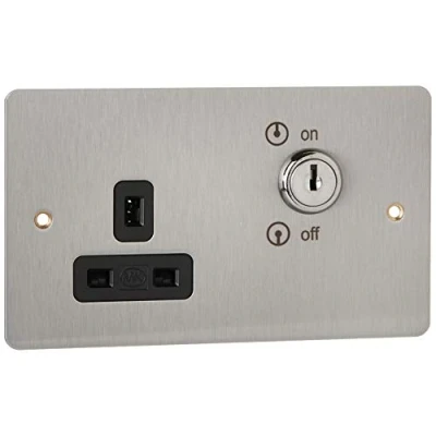Lockable 13A, single gang, double pole switched socket Two earth terminals on a common busbar provide a double earth facility for installations that require a high integrity protective connection Brushed Chrome finish Black inserts Stylish slim line design with a frontplate profile of only 1.5mm, Manufacturer: MK