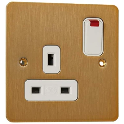 Single gang, switched socket outlet with double pole switching and neon indicators Two earth terminals on a common busbar provide a double earth facility for installations that require a high integrity protective connection Satin Gold finish White Inserts Stylish slim line design with a frontplate profile of only 1.5mm, Manufacturer: MK