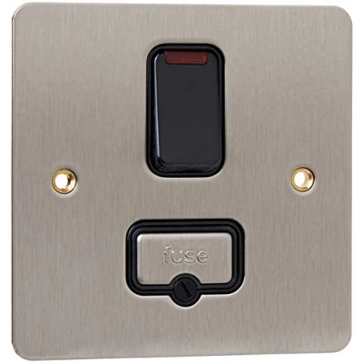13A fused and switched connection units with neon indicator included in the rocker switch Designed for the connection of refrigeratiors, water heaters, central heating boilers and other fixed appliances Lacquered Brushed Steel finish Black inserts Stylish slim line design with a frontplate profile of only 1.5mm, Manufacturer: MK