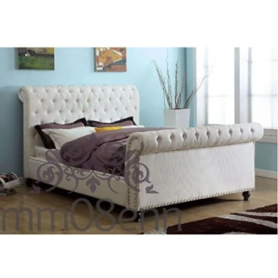mm08enn Chenille Fabric Upholstered Chesterfield Sleigh Studs Bed frame Double 4ft6 (Cream, Double)