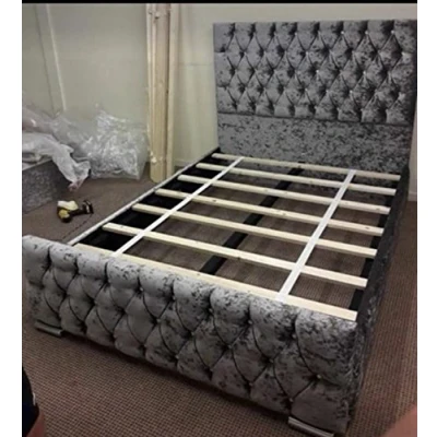 Luxury top quality Crystals Diamante atn bed in crushed velvet fabric . The bed base is designed on a solid build structure. The fabric is elegant and durable making it suits any bedroom. Easy assemble -Upholstered In 100% FR Crushed Velvet Fabric -Under Mattress Storage Bed Frame -Headboard Height: 47" - Footboard Height: 22" -Cubed High Foot End Bed Frame. Hand made in Great Britain -Striking Crystal Stud along with its modern chrome feet - If you need mattress please message us for quote.