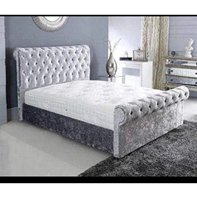 Brand New Upholstered Bed Frame in crushed velvet FR Treated fabric for peace of mind * Choice of Matching Buttons & Crystal Diamante * Bed Frame Size 3ft Single, 4ft6 Double & 5ft King Size in Stock * Headboard Height approx. 46 inches & Footboard Height approx. 20" * Complete Bed Frame (Comes with Headboard, Footboard, 2x side rails & slats all fixing fitted (Mattress is not included )