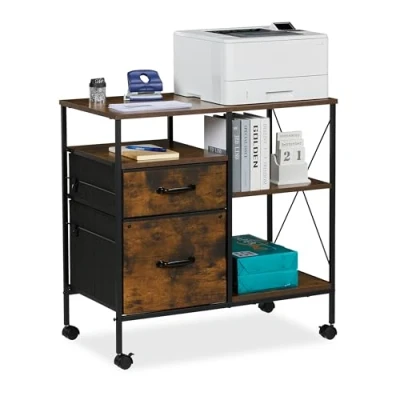 AmazonOrganisation: Office cabinet for neat storage of documents in the office or study Storage: Two drawers and three shelves in the wheeled unit provide ample office storage Mobile: With 360° swivel casters, the mobile cabinet can be used anywhere – 2 wheels with brakes Versatile: Filing cabinet with hanging file rails - space for a printer or coffee machine Basics: File cabinet made of MDF and steel with fabric drawers - HxWxD: approx. 75.5 x 76.5 x 40 cm