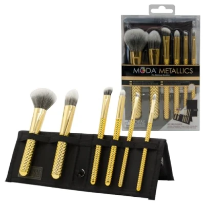 Moda Royal & Langnickel Travel Size Metallics Total Face Makeup Brush Set with Pouch, Includes Powder, Foundation, Angle Shader, Smoky Eye, Brow Liner and Pointed Lip Brushes, Gold