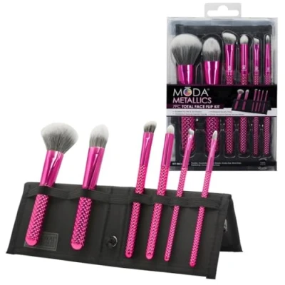 MODA Royal & Langnickel Travel Size Metallics Total Face Makeup Brush Set with Pouch, Includes Powder, Foundation, Angle Shader, Smoky Eye, Brow Liner and Pointed Lip Brushes, Pink