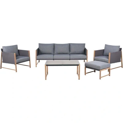Modern 5 Seater Garden Sofa Set Metal Frame Wood like Finish with Table and Ottoman Grey Cushions Nola