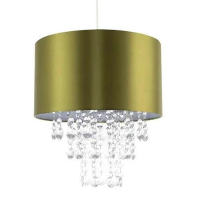 Modern and stylish non-electrical easy fit pendant lighting shade. Simply attaches to your existing pendant rose. High-quality olive green satin fabric material shade with hanging clear acrylic droplets which give off an eye-catching crystal effect when light shines through. The total product dimensions are as follows: Height - 17cm, Width - 30cm, Depth - 30cm. Maximum wattage allowed is 11w. Please note that ceiling rose and cable is not included - pendant shade only being sold. Complete with shade reducer ring allowing for all lamp bulb bases - B22/BC, E14/SES and E27/ES. Light bulb is not included., Weight: 1.322773572 Pounds, Manufacturer: Happy Homewares