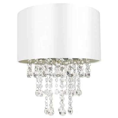 Contemporary and stylish non-electrical easy fit pendant light shade. Simply attaches to your existing pendant rose. High quality white satin shimmer fabric material shade with hanging clear acrylic droplets which give off an eye-catching crystal effect when light shines through. Product dimensions as follows: Height - 17cm, Width - 30cm, Depth - 30cm. Maximum wattage allowed is 60w. Please note that ceiling rose and cable is not included - pendant shade only being sold. Complete with shade reducer ring allowing for most lamp bases - B22/BC, E14/SES and E27/ES. Light bulb not included., Weight: 1.322773572 pounds, Manufacturer: Happy Homewares