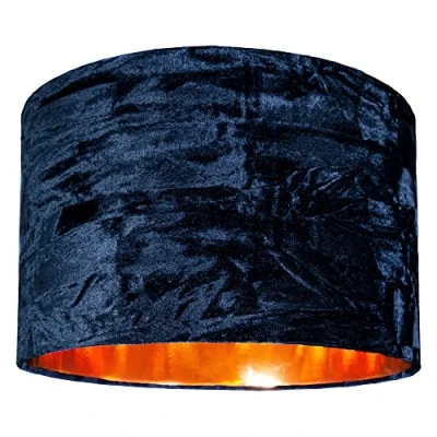 Modern and stylish high quality circular drum lamp shade which is currently very on-trend. Works well in any room of the house as well as commercial such as bars, restaurants, cafes and hotels etc. Made of high quality midnight blue crushed velvet fabric with unique shiny copper paper inner creating a stunning effect when the light bulb is switched on. The product dimensions are: Height - 22cm, Top diameter - 35cm, Bottom diameter - 35cm. Maximum wattage allowed is 60w. Features a reversible gimbal allowing usage for both table lamps and pendant ceiling roses. Please note that only shade is included. Complete with shade reducer ring allowing for most lamp lamp bases - B22/BC, E14/SES and E27/ES. Light bulb not included., Weight: 2.0723452628 pounds, Manufacturer: Happy Homewares