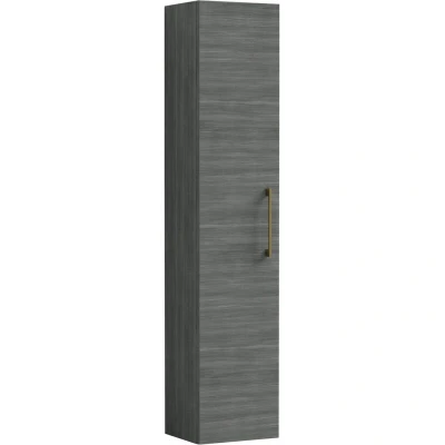Modern Bathroom Wall Hung 1 Door Tall Storage Unit Woodgrain Anthracite with Brushed Brass Handle, 1433 x 300 235mm