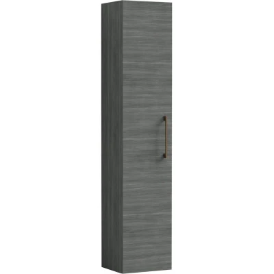 Modern Bathroom Wall Hung 1 Door Tall Storage Unit Woodgrain Anthracite with Brushed Bronze Handle, 1433 x 300 235mm