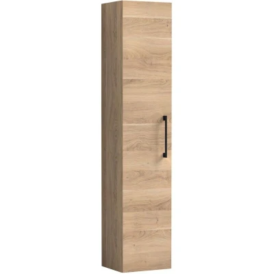 Modern Bathroom Wall Hung 1 Door Tall Storage Unit Woodgrain Light Oak with Black Handle, 1433 x 300 235mm