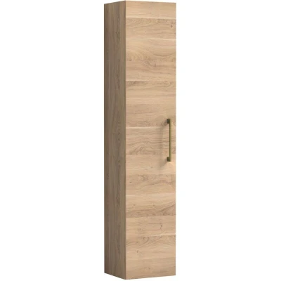 Modern Bathroom Wall Hung 1 Door Tall Storage Unit Woodgrain Light Oak with Brushed Brass Handle, 1433 x 300 235mm