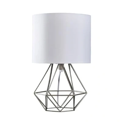 Modern Brushed Chrome Metal Basket Cage Bed Side Table Lamp with a White Fabric Shade