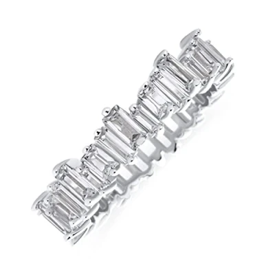 Express your eternal love with our stunning eternity-style wedding bands, featuring alternating sizes of rectangular emerald-cut baguette stones that enhance her beauty on your big day and beyond. Material: Genuine .925 Sterling Silver Anti Tarnish Rhodium Plated, Cubic Zirconia, HYPOALLERGENIC - Lead-Free Nickle-free. Each piece is stamped .925 guarantees quality and craftmanship. Measure: 5.5 MM Band Width, Weight: 3.2 Gram Eco-Friendly Elegance: Choose Cubic Zirconia Jewelry as a sustainable alternative to diamonds. Lab-created CZ minimizes environmental and social impacts associated with diamond mining. Enjoy flawless beauty that only a jeweler can distinguish. Thoughtful Gifts for Every Occasion: Whether it's Mother's Day, an Anniversary, Wedding, Birthday, Holiday, Stocking Stuffer, Christmas, Valentine’s Day, or Graduation, our exquisite jewelry is the perfect present. Ideal for expressing your love to your Sister, Mother, Grandmother, Daughter, Wife, Girlfriend, Aunt, Mum, Mommy, Grandma, or even for yourself. It's the ultimate gift for anyone special in your life. USA-Based Company with 30-Day After-Sale Service: We take pride in our craftsmanship and product quality. Rest assured, if you receive an item with manufacturing defects, we've got you covered. Click on the link to contact our friendly customer service.