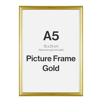 A modern Gold picture frame with an elegant gloss finish and sleek 9.8x16.5mm (Width, Depth) profile. This photo frame is designed to hold an A5 (15x21cm) photo or picture. The overall size of the frame is approximately 23x17cm Create gallery displays with multiple frames. Think of Family photo collections, memory walls, or a collection of jaw-dropping iconic black-and-white pictures. A fantastic picture frame for your home, office, or as a gift. Crystal clear and shatter-resistant Plexiglass front. A protective film is applied on both sides – remember to remove the film before use. Wall-mounted or freestanding. This picture frame has an MDF back panel with pre-attached landscape or portrait orientation hangers and an MDF frame easel for tabletop display.
