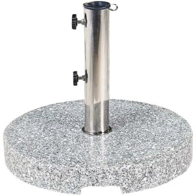 General description This round parasol base is designed to provide stability for your garden umbrella, ensuring it withstands wind and offers proper shade during hot days. Made from durable, high-quality granite, it requires minimal maintenance and is resistant to UV rays, water, and corrosion, making it an excellent choice for outdoor spaces. Technical specifications Product Type: Parasol Accessories General Color: Grey, Silver Main Material: Granite Additional Material: Stainless Steel Shape: Round Dimensions: Depth: 45 cm, Width: 45 cm, Height: 36 cm Pole Diameter Compatibility: 38 - 58 mm Weight: 25 kg Installation Partial assembly required Assembly time: Approximately 15 minutes Usage Suitable for outdoor use in temperatures ranging from -5 °C to +80 °C Recommended to use a protective cover during off-season or heavy rain Other information To maintain granite, avoid cream cleaners and acidic or oily cleaners For stainless steel, clean only with mild cleaning agents and avoid