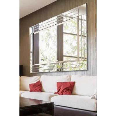 Large Full length frameless triple bevelled edge Venetianwall mounted mirror with block corners will add style and character to any room, from the living room to the bedroom and will even make a chic bathroom mirror This has an overall size of 4ft9 x 3ft9, 144cm x 115.5cm and can be hung either landscape or portrait. We also stock this mirror in other sizes Classical Antique Style Venetian Wall Mirror Which Can Be Hung Either Portrait or Landscape. Do Not Use String to Hang This Mirror, Please Use Heavy Duty Fixings. Create a Modern Statement for your Lounge, Dining room, Bedroom or Kitchen. With a triple silver outline and bevelled glass this mirror truly will bring any room alive Explore MirrorOutlet Full Range of Venetian and Classical Full Length Leaner and Wall mounted mirrors