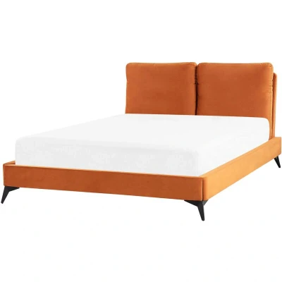 General description Upholstered Bed Frame with Cushioned Headboard. Spruce up the look of your bedroom with this elegant bed. Its soft-touch, velvet upholstery makes it fit nicely with many décor styles, best harmonizing with Scandinavian and vintage-inspired interiors. Thickly padded cushions fixed to the headboard with a zip will additionally increase the comfort of use. The frame is supported on black legs, beautifully contrasting with the bed’s colour. Technical specifications Product Type: Double Bed Style: Modern General Color: Orange, Black Main Material: Velvet Material Composition: 100% Polyester Fabric Dimensions: Width: 156 cm, Length: 233 cm, Height: 95 cm Headrest Dimensions: 145x85 cm Sleeping Surface: 140x200 cm Weight: 41 kg Weight Capacity: 250 kg Assembly Information: Full Assembly Required (45-60 min) Offer Includes: 1 x Bed Frame, 1 x Slatted Frame (26 Sprung Slats) Not Included: Mattress, Bedding and Cushions Usage Suitable for All Types of Mattresses Blends Well