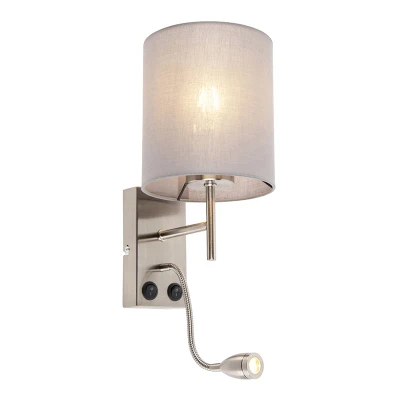 General description Add a modern touch to your home with the Stacca. This wall light is perfect for enhancing your wall's aesthetic with its stylish design. Made of steel and featuring a light grey cotton shade, it combines practicality with elegance. The charming wall light includes a built-in reading lamp that can be adjusted to your preference, making it ideal for reading in your bedroom or living room. Technical specifications Material: Steel Shade material: Cotton Shade diameter: 16 cm Height: 47 cm Flexible reading arm length: 24 cm Bulb holder: E27 Max wattage: 1 x 1 W Voltage: 220V/230V Protection class: IP20 Non-dimmable Light source: Included LED reading lamp: 100 lumens, 2700 Kelvin (warm light) Compatibility and accessories Compatible with E27 light sources (max 40W) Installation Easy to install with on/off buttons on the mounting plate Allows separate control of the lamp and reading lamp Usage Perfect as a reading light in bedrooms Suitable for indoor spaces such as