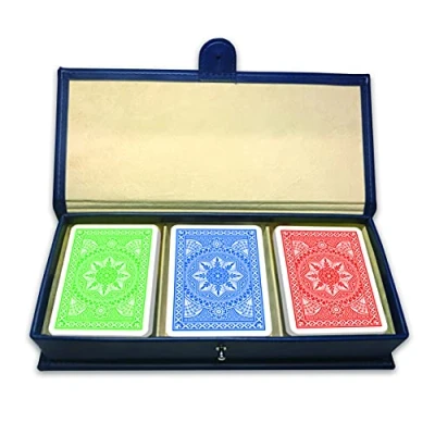 Blue leatherette packaging made in Italy contains 3 bunches burraco duplex cardboard, Manufacturer: Modiano
