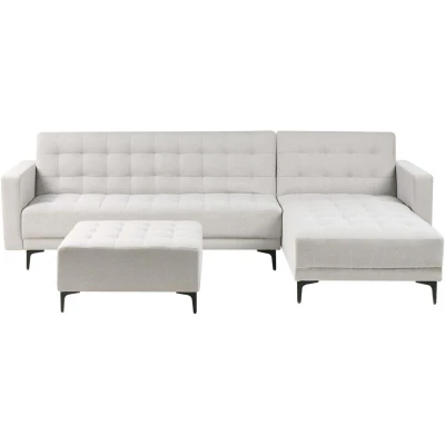Reversible Sofa Bed with Chaise Longue. This large corner sofa and ottoman set is an ideal anchor piece for your living room, inviting and homely. Versatile in design, the sofa can be turned into a comfortable bed for two thanks to the adjustable backrest. Additionally, the chaise can be positioned on either side to suit your needs. Fully upholstered in high-quality, smooth fabric and decorated with elegant tufting, it suits any interior colour scheme. The piece is elevated on sleek black metal legs that add a contemporary touch and subtle contrast. Due to its modular design, it can be combined with other elements from the collection to create a seating arrangement tailored to suit you. Details: Product Type: Modular Sofa General Color: Grey, Black Shade: Light Grey Material Type: Fabric Main Material: Fabric Additional Material: MDF Filling Material: Foam Material Composition: 100% Polyester Shape: L-Shaped Arm Style: Track Leg Caps/ Pads: Yes Modular Pieces: Yes Orientation: Left