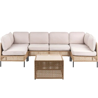 AmazonStylish outdoor modular set with coffee table designed to create an inviting lounge area Constructed with a powder-coated steel frame and weather-resistant PE rattan for reliable outdoor use Includes soft cushions with water-repellent covers and glass table, providing everyday comfort Practical connectors keep the modules together and ensure easy seating reconfiguration Requires assembly, manual included