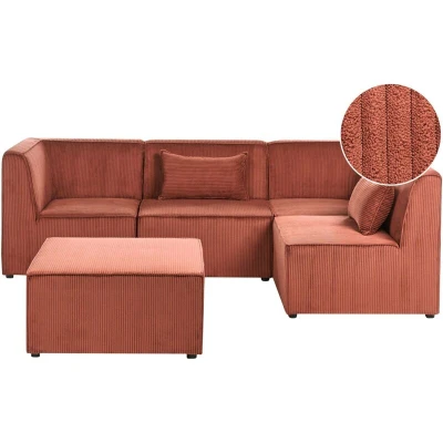 Modern 4 Piece Jumbo Cord Sectional Sofa with Footstool. Make your living room stylish and well-arranged with this modern sectional sofa. The corduroy upholstery is soft to the touch and features a striking ribbed texture, which gives it an elegant look, additionally the piece is supported by the legs made of synthetic material. The corner sofa consists of four modular sections, that you can put together or separately to make various configurations. The sofa comes with a multifunctional ottoman, use it as an extra seat, footrest or table. The additional cushions feature a removable cover that translates to easy cleaning without a worry for stains. Details: Product Type: Modular Sofa General Color: Brown Shade: Golden Brown Material Type: Fabric Main Material: Corduroy Additional Material: Synthetic Material Filling Material: Foam Material Composition: 100% Polyester Shape: L-Shaped Arm Style: Track Fabric Upholstered Back: Yes Leg Caps/ Pads: No Orientation: Right Hand Pattern: Solid