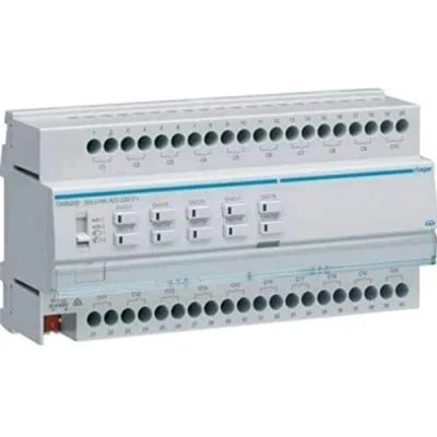 Switch/blind actuator 20/10-speed KNX easy 16A C-load Shift/blind actuator REG for switching an independent load per actuator channel or control of a blind drive via two actuator channels of any mixing operation of drive and switching functions In-line installation device with integrated bus coupler plug-in terminals for KNX bus connection load/switching connections and labelling field 10 control buttons (switching channel 1-10 and switching to channel 11-20) for manual operation per output with status LED (single surface operation) Slide Switch Auto/Hand Illuminated Programming Button, Weight: 0.02 pounds, Manufacturer: Hager