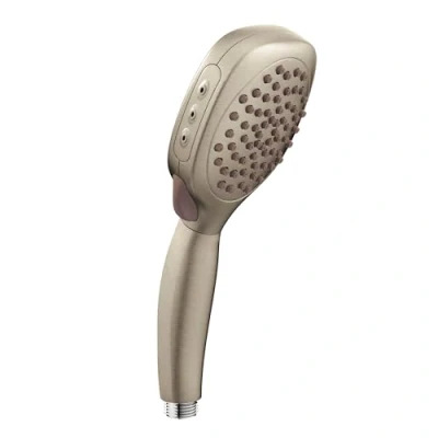 Handheld showerhead part of Moen twist shower collection that featuring a twisting showerhead experience providing 4 different shower functions with each twist 3-3/4 inch diameter spray head produces a max 2.0 gpm that ensures an eco-friendly spray head without sacrificing performance Bathroom shower head functions: combination, full spray, invigorating spray, targeted massage Brushed Nickel finish brings the warm look of stainless to your bathroom, Weight: 0.9 pounds, Manufacturer: Moen