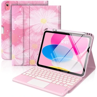 MoKo iPad 11th/10th Generation Case with Keyboard 2025/2024, 7 Colors Backlight & Multi Touch Trackpad, Detachable Folio Stand Cover Pencil Holder, Coreopsis