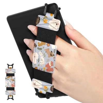MoKo Soft Hand Strap for 6 8" Kindle eReaders Fire Tablet Kindle/Kobo/Voyaga/Lenovo/Sony E Book Tablet, Black High Elasticity Versatile Lightweight Finger Grip Holder, Happy Dogs