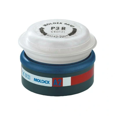 General description The Moldex MOL9230122 Series 7000/9000 EasyLock® A2P3 R pre-assembled filters provide respiratory protection against organic gases and vapors with a boiling point above 65°C, as well as airborne contaminants such as dust, fumes, and water or oil-based mists. These filters are designed for use with Moldex Series 7000 and 9000 masks and feature an easy-to-use locking system that eliminates the need for additional clips or holders. They can be connected directly to the mask or to gas cartridges, allowing for flexible and secure filtration. Technical specifications Protection class: A2P3 R Color: Brown Type: Adaptable Filter Filter material: Particulate and gas filter Certification: EN 14387:2004+A1:2008 Particulate filtration efficiency: P3 (against harmful dusts, fumes, and aerosols) Gas filtration: A2 (against organic vapors with Bp > 65°C, 5000 ppm) Filter dimensions: Compatible with Series 7000/9000 masks Compatibility and accessories Compatible with Moldex Series