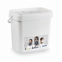 Stable buckets with carry handle and resealable lid. Fits a fully assembled full face mask with filters. Includes writable name label.