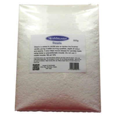 Increases the melting point of candle wax, resulting in a longer burning time Increases the opacity and shine of the candle Stearin hardens wax adding to the rigidity of the candle Adds the dissolution of dye and perfume Aids with demounding of candles