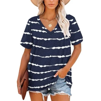 MOLERANI Ladies Tops Women Short Sleeve V Neck Striped Summer Casual Loose Tee Navy Wavy Size 10 12