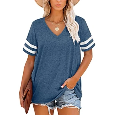 Soft Material:This cute shirts is made of quality 65% Polyester and 5% Spandex, It is a lightweight, loose,stretchy,soft and comfortable fabric, It fits the body of most Lady’s shape. Features: V Neck, Striped Sleeve-are its unique features, This wonderfully cozy blouse is such an effortless choice for any day! Match: This soft and comfortable short sleeve T-shirt is the best choice for this summer!Featuring a trendy color!It's perfect with all kinds of jeans, leggings or skirts,looks stylish and beautiful.We believe good clothing has the power to inspire confidence and beauty. A Must-Have Womens Tops in Your Wardrobe. Occasion: Casual, everyday, Running, outdoor, travel, shopping, vacation, at party, dating, Work, or at home.The White Color and other Light Colors are a little bit see through, please use a nude or lighter color underwear,and don't have to wear a slip. Garment Care: Recommend Hand-washing or Machine-washing with Cold Water or Warm Water Below 30°.