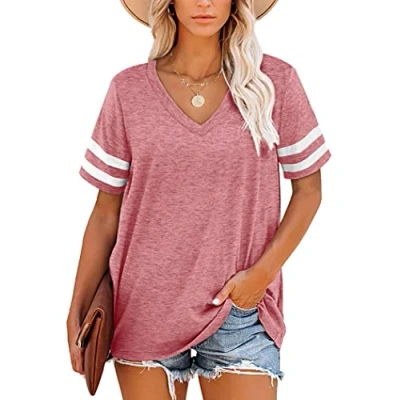 Soft Material:This cute shirts is made of quality 65% Polyester and 5% Spandex, It is a lightweight, loose,stretchy,soft and comfortable fabric, It fits the body of most Lady’s shape. Features: V Neck, Striped Sleeve-are its unique features, This wonderfully cozy blouse is such an effortless choice for any day! Match: This soft and comfortable short sleeve T-shirt is the best choice for this summer!Featuring a trendy color!It's perfect with all kinds of jeans, leggings or skirts,looks stylish and beautiful.We believe good clothing has the power to inspire confidence and beauty. A Must-Have Womens Tops in Your Wardrobe. Occasion: Casual, everyday, Running, outdoor, travel, shopping, vacation, at party, dating, Work, or at home.The White Color and other Light Colors are a little bit see through, please use a nude or lighter color underwear,and don't have to wear a slip. Garment Care: Recommend Hand-washing or Machine-washing with Cold Water or Warm Water Below 30°.