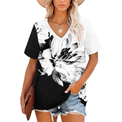 MOLERANI T Shirts for Women Tops Short Sleeve V Neck Striped Summer Casual Loose Tee Ink Black White Flower M